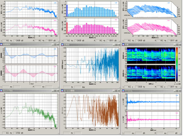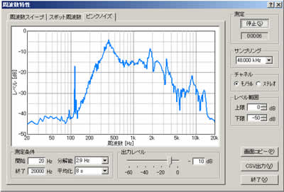 周波数に対するレベルの変化をグラフ化し、周波数スイープ、スポット周波数、ピンクノイズの3種類の方法で測定を行うことができます。