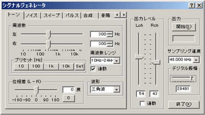 7つの機能(トーン、ノイズ、スイープ、パルス、合成(複合音)、音階、波形)があり、2chの正弦波、三角波、方形波、のこぎり波などの指定周波数のトーン信号、ホワイトノイズ、ピンクノイズなどの雑音、トーン信号を時間ごとのオクターブで変化させたスイープ音、パルス信号を指定回数、指定の長さ、指定間隔で出力します。