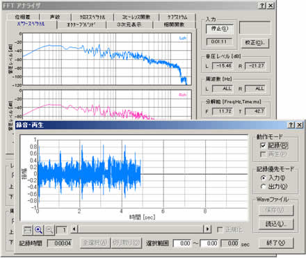 録音した音の再生と同時に、リアルタイムアナライザ、オシロスコープで測定したり、WAVEフォーマットのファイルを読込み、再生、測定することも可能です。